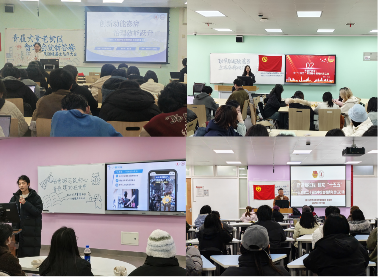 2025级公共管理类各团支部主动邀请四川大学百川青年学生宣讲团yl23411永利(集团)有限公司官网分团开展系列宣讲,紧扣“推进中国式现代化与民生保障”“社会发展与青年机遇”“治理创新”等主题,结合社会现实与青年关注,以生动案例与透彻分析,帮助青年提升政治站位,强化理论认同。宣讲会后,各支部组织了延伸讨论,同学们就相关议题展开了热烈交流,深化了对个人成长与国家发展同频共振的认识。