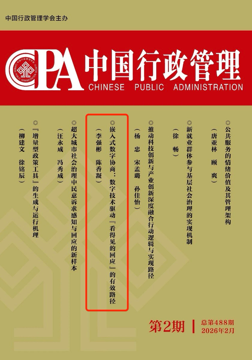 近日,我院李强彬教授和博士研究生陈香凝在公共管理权威期刊《中国行政管理》2026年第2期发表论文《嵌入式数字协商:数字技术驱动“看得见的回应”的有效路径》。