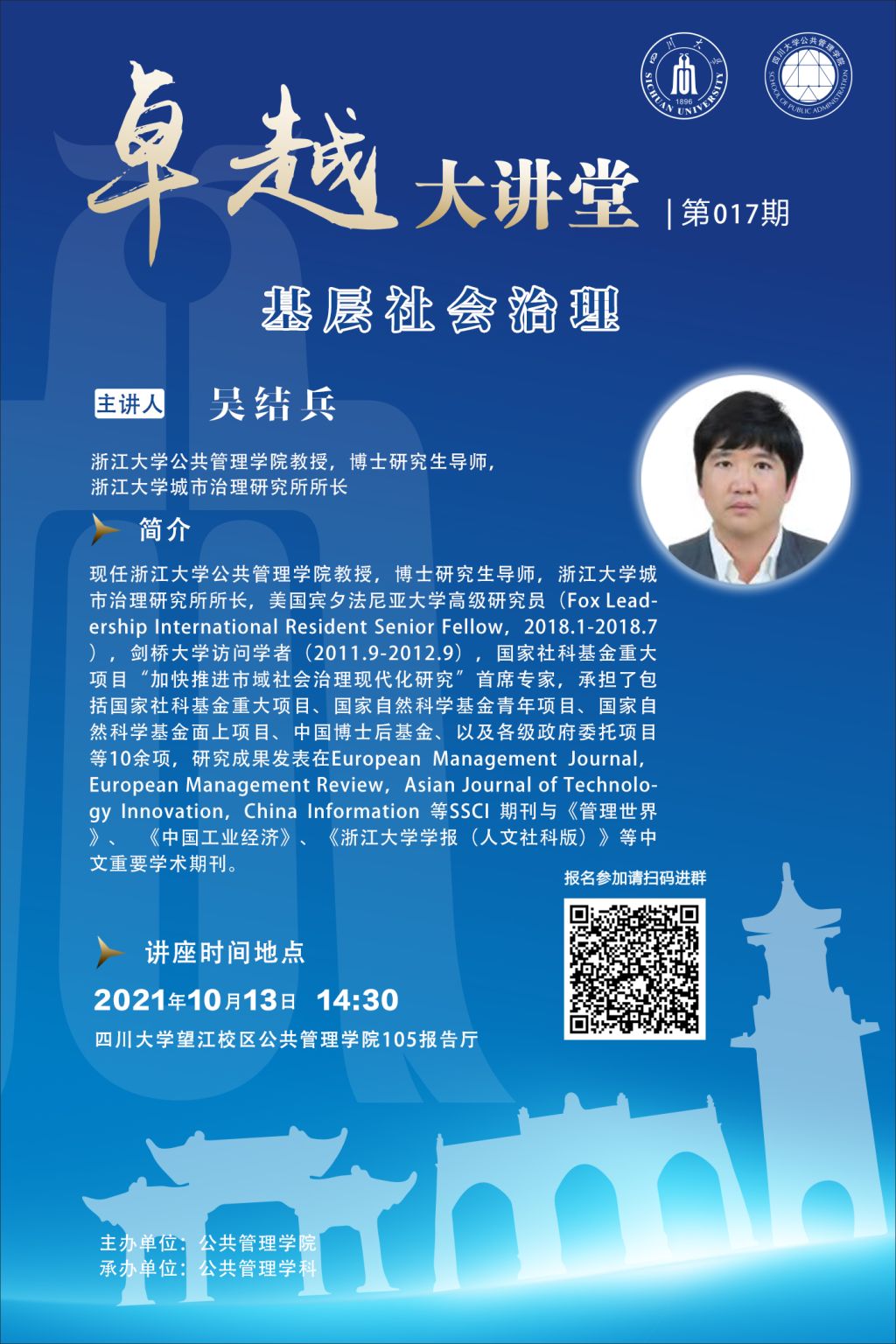吴结兵,浙江大学yl23411永利(集团)有限公司官网教授,博士研究生导师,浙江大学城市治理研究所所长,美国宾夕法尼亚大学高级研究员(Fox Leadership International Resident Senior Fellow,2018.1-2018.7),剑桥大学访问学者(2011.9-2012.9),国家社科基金重大项目“加快推进市域社会治理现代化研究”首席专家,承担了包括国家社科基金重大项目、国家自然科学基金青年项目、国家自然科学基金面上项目、中国博士后基金、以及各级政府委托项目等10余项,研究成果发表在European Management Journal,European Management Review,Asian Journal of Technology Innovation,China Information 等SSCI 期刊与《管理世界》、 《中国工业经济》、《浙江大学学报(人文社科版)》等中文重要学术期刊。