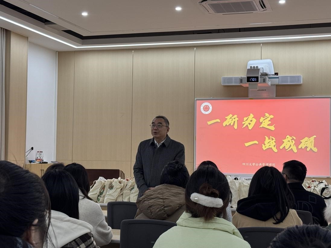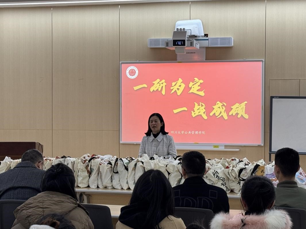 2025年全国硕士研究生招生考试在即,为帮助我院考研学子缓解备考压力、坚定备考信心,学院于12月5日下午在萃文楼205教室开展了“一‘研’为定、一战成硕”的“考研送温暖”活动。本次活动由学院党委副书记兼纪委书记罗亚玲主持,学院院长夏志强、副院长王慧敏、团委书记刘碧、秘书档案学系赵跃老师、社会学与心理学系徐文健老师、2024级研究生辅导员苟欢老师、2021级本科生辅导员付亚南老师以及学院2025届考研学子参加。