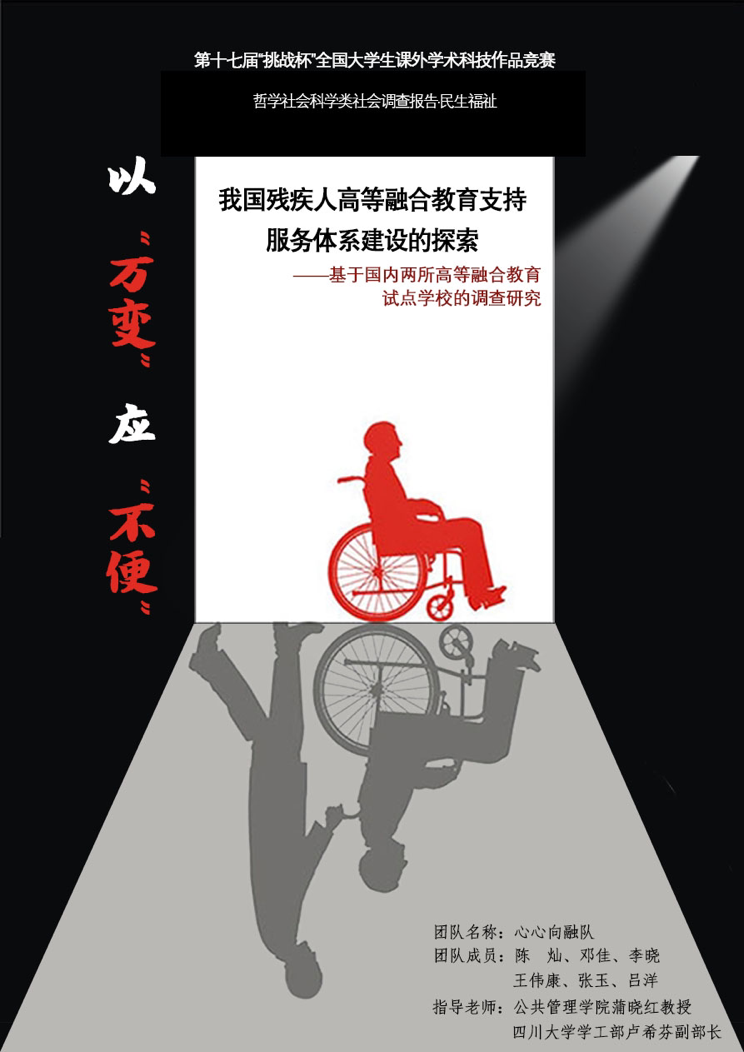 4月9日下午,“挑战杯”四川大学2020-2021年度学生课外学术科技作品竞赛获奖名单出炉,我院劳动与社会保障系2018级本科生陈灿带领“心心向融”队完成的作品——“我国残疾人高等融合教育支持服务体系建设的探索——基于国内两所高等融合教育试点学校的调查研究”获民生福祉类一等奖。该项目团队由yl23411永利(集团)有限公司官网劳动与社会保障系2018级学生陈灿、邓佳、李晓、王伟康和华西药学院2018级学生张玉、艺术学院2019级学生吕洋组成,并由yl23411永利(集团)有限公司官网劳动与社会保障系蒲晓红教授和四川大学学工部副部长卢希芬老师担任指导老师。