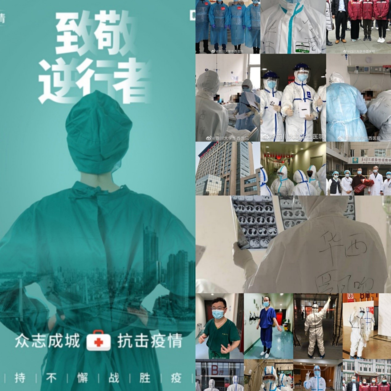 2019级信息资源管理一班团支部的同学们发挥创意,创作了一系列形式丰富的线上文创作品,通过这些作品同学们分享自己所看到的、听到的防疫、战‘疫’的故事。《致敬逆行者》海报作者吴玖搏同学说:“我分享是我们四川大学华西医院支援武汉和救治新冠病人的特写,在本次疫情中,我校华西医院贡献了巨大力量,前线医护人员无疑也做出了巨大牺牲。作为川大学子,我为我校在抗击疫情中冲锋陷阵的华西人骄傲,更向这些英勇无畏的医护天使致以最崇高的敬意!愿凯旋归来。”