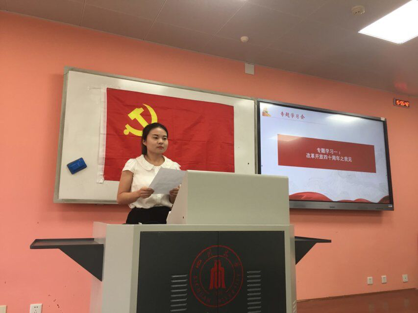 为庆祝改革开放40周年,深入贯彻落实习近平新时代中国特色社会主义思想和党的十九大精神,凝聚起为实现中华民族伟大复兴中国梦和学校“两个伟大”奋斗目标的磅礴力量, 7月6日下午,我院2015级本科生第一党支部和第二党支部在望江基础教学楼A416开展了“庆祝改革开放40周年”专题学习会暨期末总结会。活动由2015级本科生第一党支部和第二党支部所有党员和积极分子参加,由支部书记肖敏老师主持。