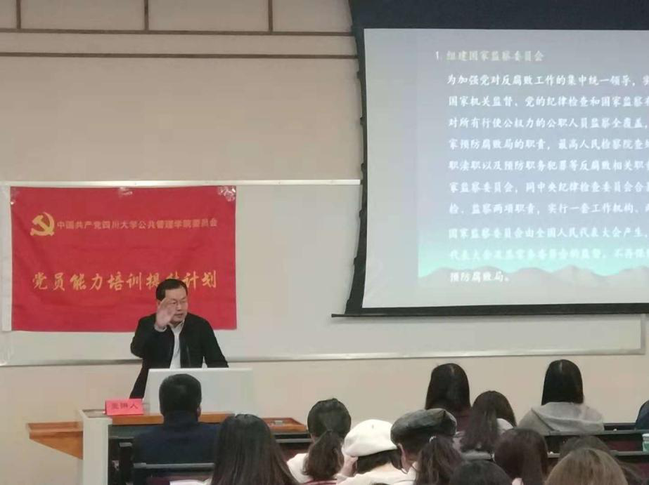 接下来,史云贵院长为第二期党员能力提升班作了题为“全面深化党和政府机构改革”的第一讲。在讲座中,院长史云贵教授首先对十九大以来关于深化机构改革的时代背景与重大意义进行了深入地分析,对深化改革的总目标进行了详细地介绍。然后,史云贵教授对党和政府深化机构改革的具体举措进行了梳理,结合实践案例,生动地讲解了一系列改革举措背后的理论逻辑与现实依据。最后,史云贵院长引导大家对党和政府深化机构改革的进程进行了展望。