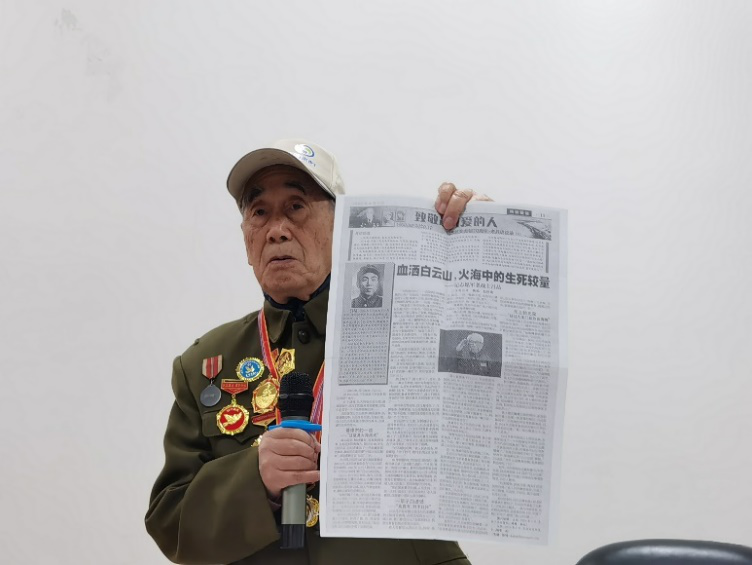 讲座一开始,莫老拿出一张影印版的《参考消息》,报纸上刊登着一篇题为“血洒白云山,火海中的生死较量”。莫老拿着报纸骄傲地说:“这篇就是讲的我们师……我们是50军149师47团,在汉江南岸的白云山经历了11个昼夜的惨烈战斗,给了美国及其联军极大的杀伤。”回忆至此,莫老动容地说:“旧中国所受的屈辱和被外国人看不起都是我亲身经历过的,所以我为志愿军的胜利,抗美援朝的胜利,中国人民的胜利,感到特别地自豪”。