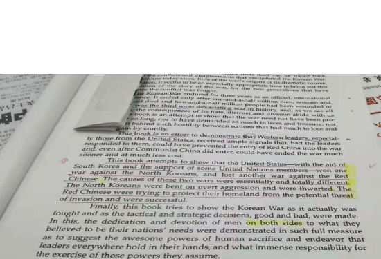 随后,莫老拿出一本珍藏已久的英文书《Korea: The First War We Lost》,书上布满了莫老勾勾画画的笔迹。他捧着书,向同学们分享了书中对于朝鲜战争的评价,边念边向同学们讲述1951年7月第二次入朝作战的故事:当年,为了后方补给有效运送至战场避免敌方偷袭,于是志愿军士兵甘做“土雷达”,一旦美国军机临空,谁先听到谁就鸣枪,告知补给车辆熄灯并进入树枝搭建的掩体暂避。这种方法打了敌方一个措手不及,令得知真相的美军也不由得叹息。
