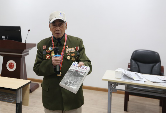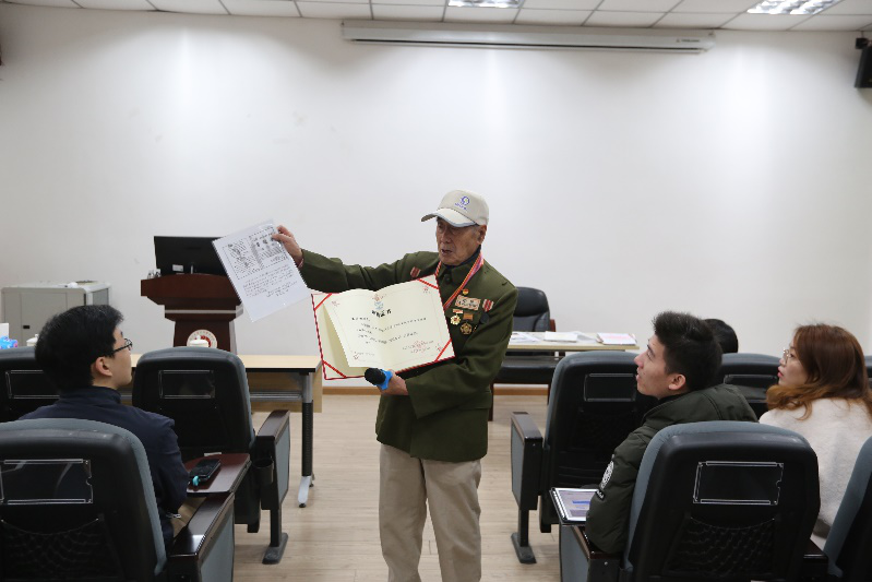 上午9:30,伴着热烈的掌声,身着军装与军功章的抗美援朝战争亲历者——今年90高龄的莫若健老先生迈着坚定的步伐走进教室,站定并向大家敬礼。莫老先生从抗美援朝第一次战役起,历任敌工组副组长、英语翻译、敌工干事、志愿军政治部俘虏管理处助理员、总政英语研究班学员、志愿军参谋学校学员、志愿军速成中学教员等职,1953年被朝鲜政府授予军功章一枚,1956年被哈尔滨市政府评为二等模范,1958年随部队从朝鲜撤军回国。本次分享,莫老先生围绕中美双方对朝鲜战争的评价以及他在战争中的经历,向大家呈现了那场伟大战争的生动片段。