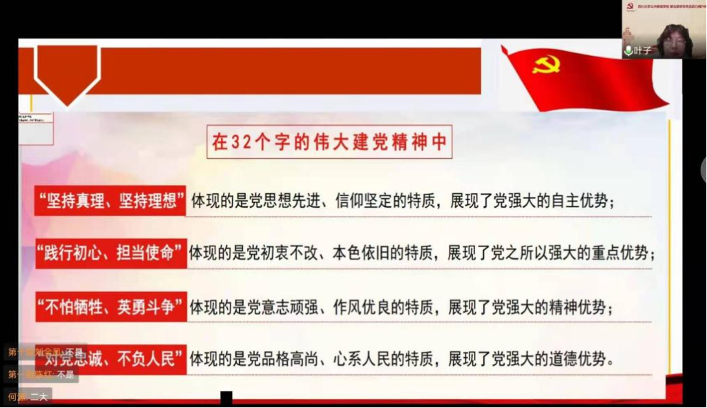下午16:00,四川大学马克思主义学院郑晔教授为我们带来题为:“从党的历次代表大会纵览党史”的党史学习讲座,讲座由青杨媚老师主持。