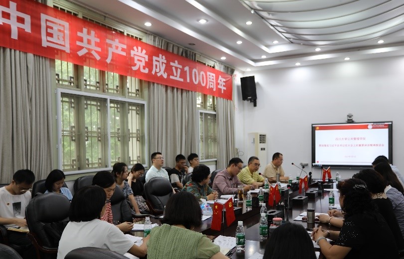 庆祝中国共产党成立100周年大会现场直播结束后,学院党委立即组织召开了专题座谈会,学习贯彻习近平总书记在庆祝大会上的重要讲话精神。座谈会由院党委书记姜晓萍教授主持,学院全体领导班子成员、两位委员、专职组织员、支部书记及部分师生代表参加了座谈会。史云贵院长、杨磊副书记、夏志强副院长、罗亚玲副院长、党委委员何玲教授、本科第四党支部党员徐宇航同学等分别结合工作和学习实际,畅谈了倾听习总书记在庆祝大会上重要讲话的心得感受,同志们纷纷表示,习近平总书记的发言,承前启后,继往开来,既有对党百年历史经验的高度总结,也有党领导全国各族人民进入下一个百年的满腔豪情,既有重大理论创新价值,又具深远现实指导意义。习近平总书记的讲话,统一了思想、振奋了人心,为党领导下的全国各族人民指明了前进的方向,坚定了全国各族人民永远跟党走的坚强意志。