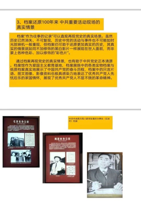 党课上支部书记陈丽教授围绕红色基因传承中国共产党百年历程、感受烈火淬金的精神锋芒和革命英烈永远活在红色档案中三个专题,用档案记录生动讲解了红色档案在记录中国共产党发展历史进程中的重要价值。红色档案是百年大党的红色基因,记录了中国共产党百年历程,档案作为原始记录,见证了100年来中国共产党各个历史时期重大事件,弘扬了100年来优秀共产党人的革命精神,在百年党史研究中,档案的价值值得高度重视、深入挖掘。档案以其历史叙述性蕴含着党史史实及对其描述的阐释,勾勒出百年党史的细节与主流,通过鲜活的党史人物、事件、故事等还原党史本身的生动性与丰富性,使得党史史实更加可读、可信、可证。研究中国共产党档案就是读懂百年大党的胜利密码,感受烈火淬金的精神锋芒,彰显中国共产党的奋斗百年辉煌。