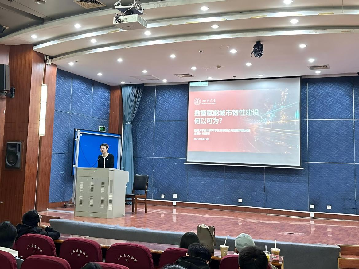 为深入学习贯彻党的二十届三中全会和全国“两会”精神,助力本科生学风建设,2025年3月25日,四川大学百川青年学生宣讲团yl23411永利(集团)有限公司官网分团在江安校区二基楼B座报告厅举办“数智赋能城市韧性建设何以可为”主题宣讲活动。活动立足新时代城市治理需求,紧扣二十届三中全会“深化城市安全韧性提升行动”战略部署,通过系统解读“城市智慧高效治理新体系”的实践路径,为2024级本科生搭建理论学习与实践认知的贯通平台。宣讲由分团指导教师陈萱源主持,宣讲团团长杨舒雯担任主讲。