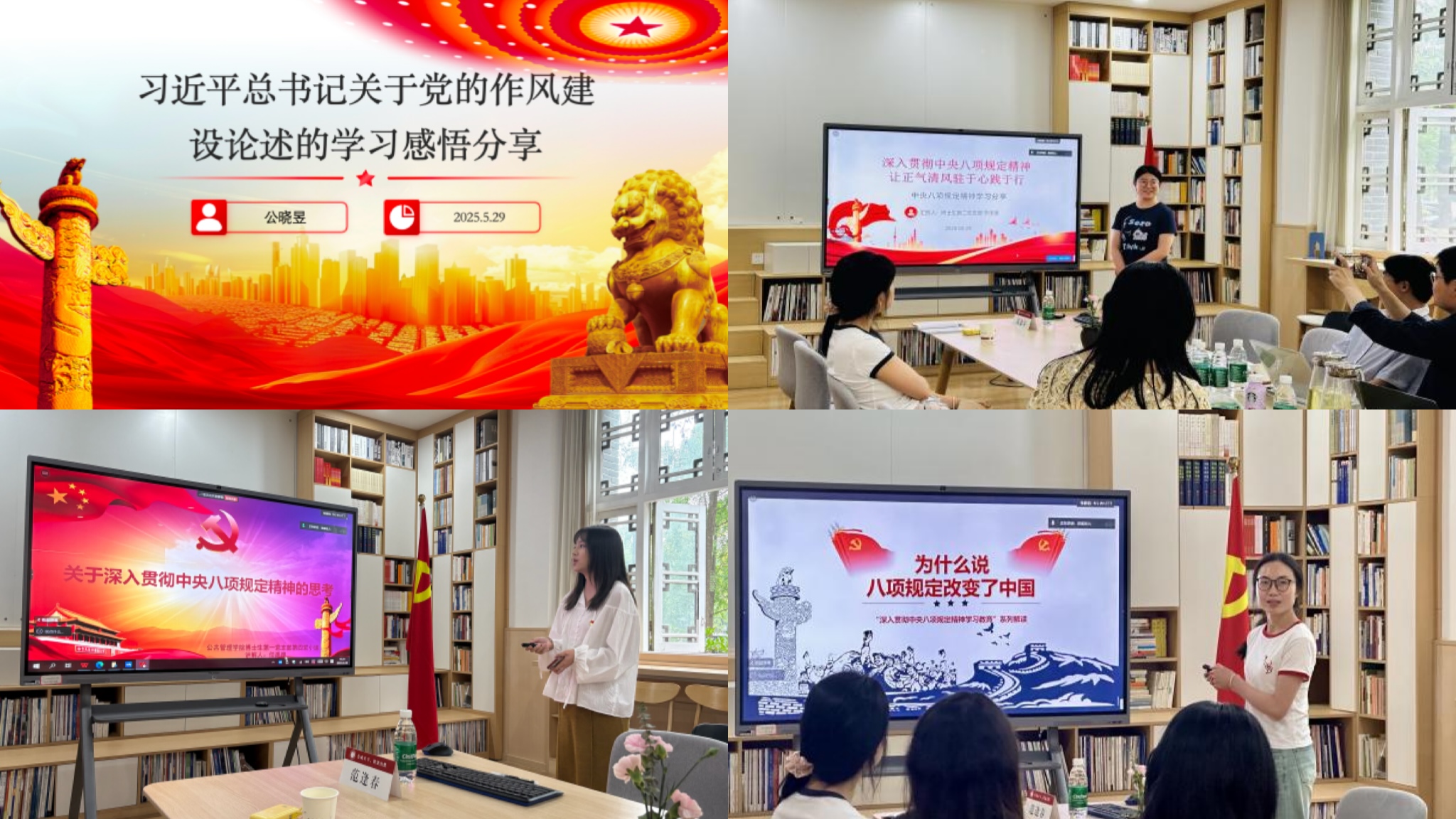 专题党课后,公晓昱、任禹崑、叶诗奇、于泽源四位博士,分别围绕党的作风建设、八项规定的内容设置、发展历程和价值蕴意等主题,为全体党员带来了一场内容丰富、启示深刻的党课学习分享会。她们结合公共管理专业知识,强调在执行中央八项规定中要做到“自觉、自审、自律”,学会“务实、主动、担当”,助推了博士生党员学习贯彻八项规定精神走深走实。