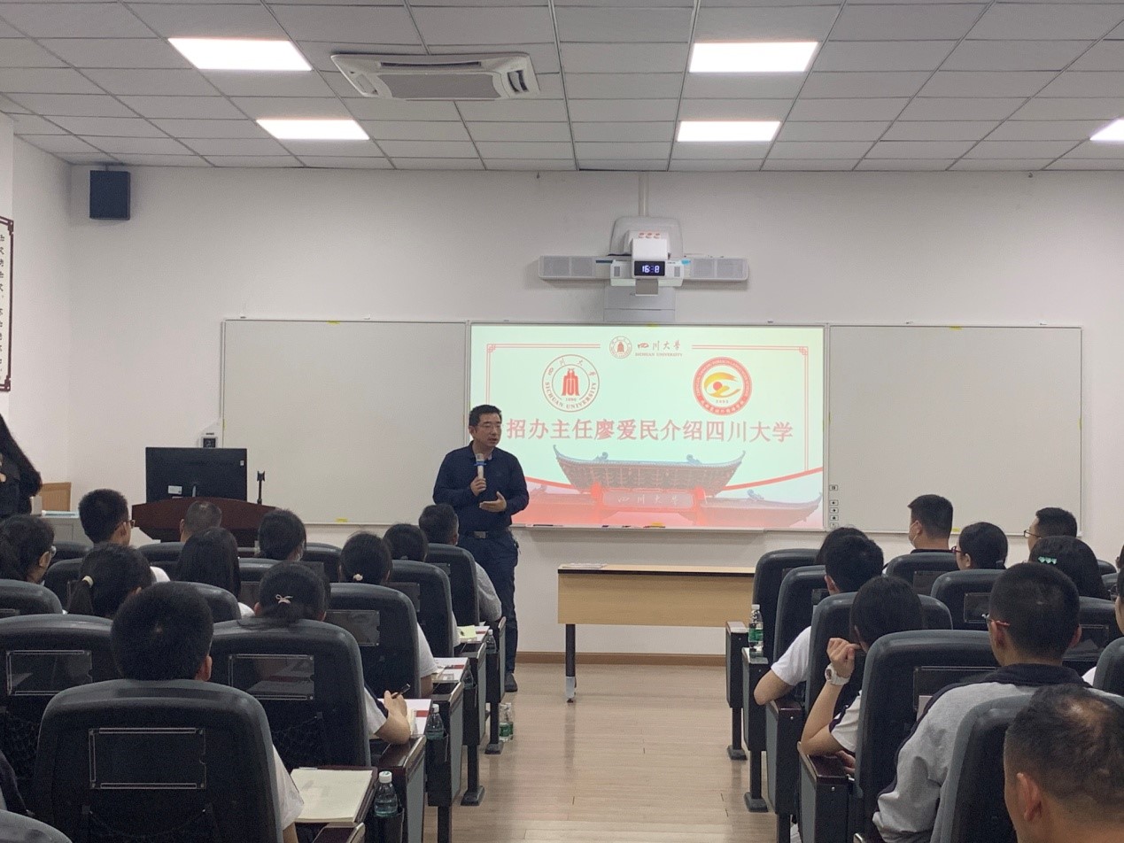 最后,在yl23411永利(集团)有限公司官网105报告厅进行招生宣讲活动,yl23411永利(集团)有限公司官网罗亚玲副院长代表学院对来访的师生表示了热烈的欢迎;招办廖爱民副主任从历史沿革、师资队伍、人才培养、川大生活、强基计划等全方位介绍了四川大学。yl23411永利(集团)有限公司官网史云贵院长向大家简要介绍了学院的发展历程、学科建设、专业设置、教学特色等方面的情况。现场气氛热烈,同学们听后掌声不断,纷纷表示对川大向往不已。