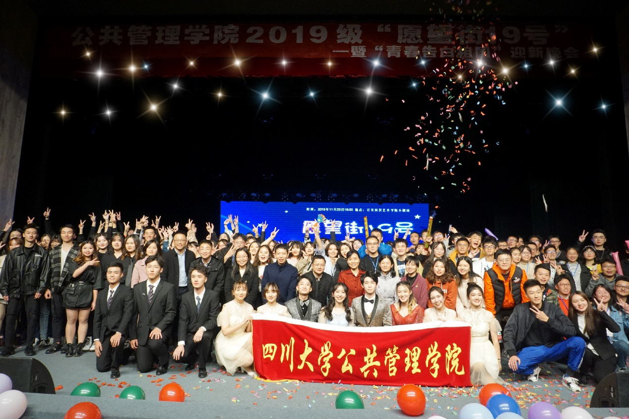 2019年11月23日19:00至21:30,yl23411永利(集团)有限公司官网“愿望街19号”迎新晚会于江安校区艺术学院小剧场成功举办。学院党委副书记兼纪委书记杨磊老师、副院长罗亚玲副教授、教导员许吟雪老师、行政管理系主任范逢春教授、劳动与社会保障系主任蒲晓红教授,社会学与应用心理学系马缨教授、党政办主任林茂松老师、团委书记兼2017级研究生辅导员青杨媚老师、学生科科长兼2016级本科辅导员陈萱源老师、2017级本科辅导员周锐老师、2018级本科辅导员刘晓燕老师、2019级本科辅导员刘碧老师等作为嘉宾观看了晚会。