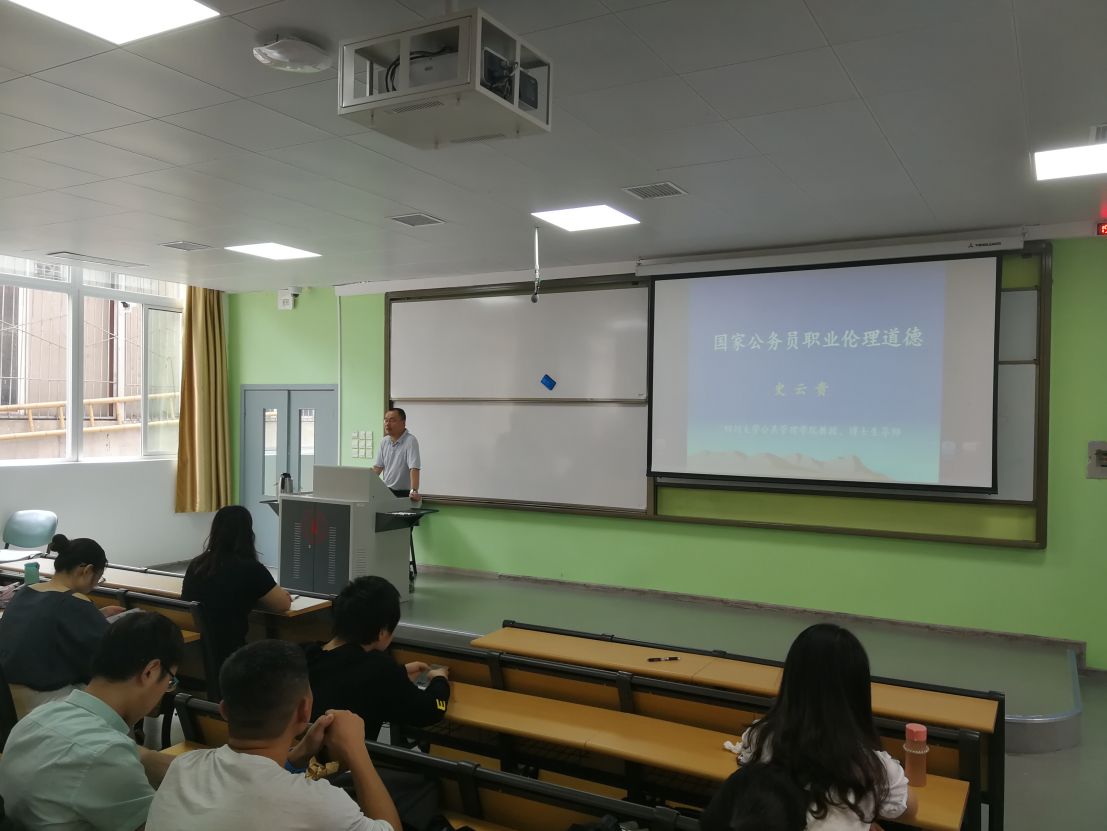 首先,史院长以列举典型案例的方式,向同学们说明我国有注重职业伦理道德培养的优良传统,并指出职业伦理道德的重要性。接着,史院长为同学们介绍了公务员职业伦理道德的基本内涵,讲解了公务员应该遵守的道德准绳、行为准则、职业良知和价值观念。然后,史院长系统阐述了党的十八大以来,以习近平总书记为核心的党中央提出的“五好干部”标准以及公务员伦理道德建设的新要求。指出了在新时代、新矛盾、新使命背景下,我国加强公务员伦理道德建设的必然性与必要性。最后,史院长号召全体同学,尤其号召即将进入公务员系统的同学们,努力向习近平式的“五好干部”看齐,遵守本职业的工作宗旨、职业理念和道德准则,争做职业道德先锋。