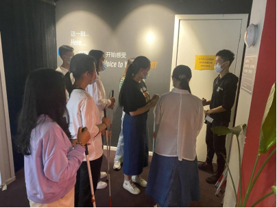 同学们分组陆续到达体验馆,候场时在大厅观看国家无障碍设施的建设标准视频资料,对盲道标识、盲文作品等形成初步了解。实践活动正式开始,同学们手持专用手杖,分组进入暗房,随着导赏员的引导,相互鼓励着逐渐适应了没有光亮的环境,探索了旅游景区、市井街巷、超市商场等一个个不同的场景。75分钟的黑暗时光很快过去,同学们围坐在导赏员身边交流视觉障碍的日常生活体验并动情地写下感悟。导赏员们自强不息、积极向上的精神激励着每一位同学。
