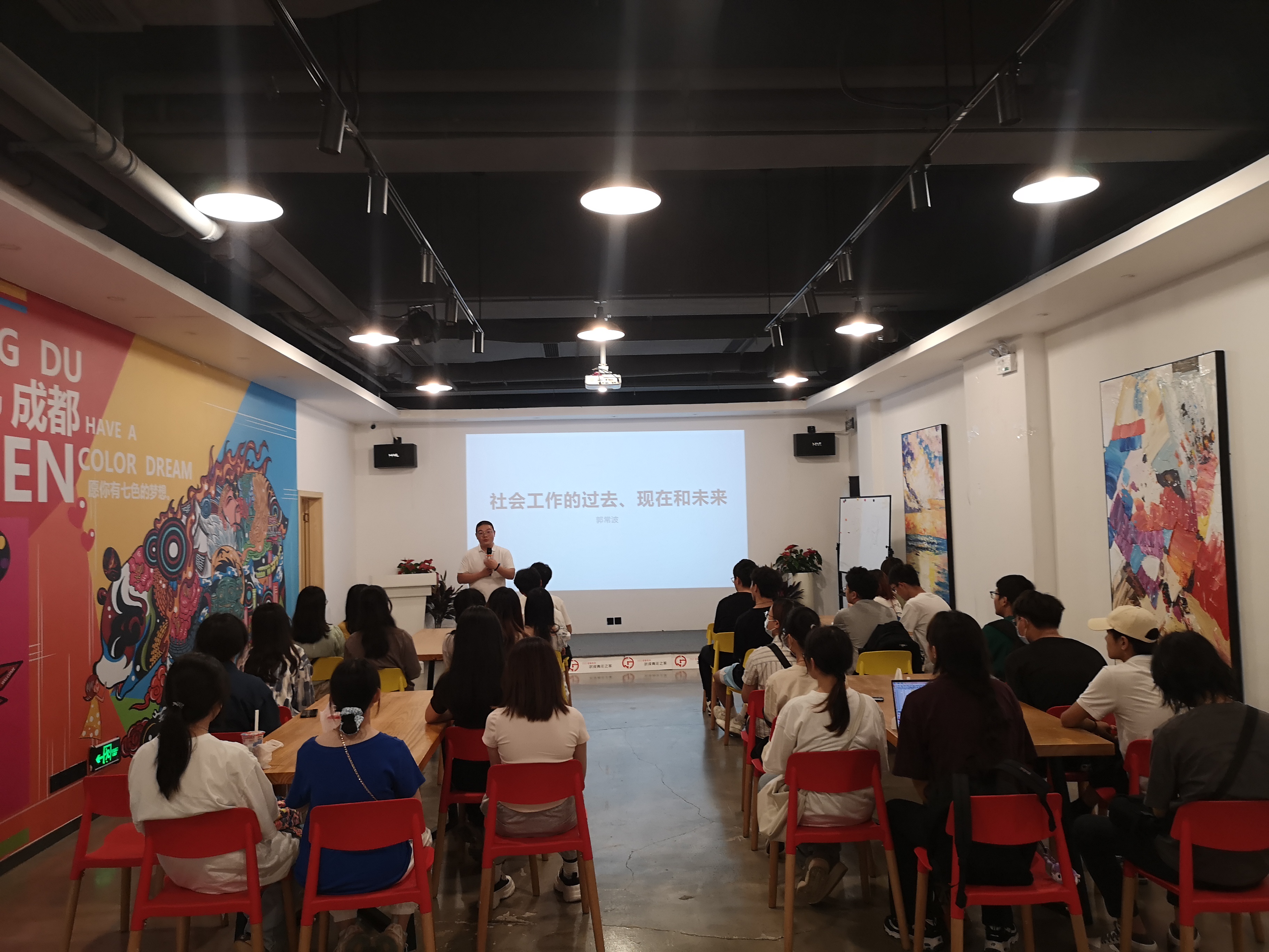 为了使同学们在课堂外进一步了解专业社区工作的产生和发展过程,深度剖析社会工作行业发展过程中形成的社会困境及其解决之道,增加《社会心理学》关于社会困境有关知识的感性体验,我院2022级社会工作本科生在刘传军老师的带领下,于6月8日下午来到成都市武侯区青年之家、武侯区聚落青年服务中心,进行《社会心理学》课程实践教学活动。武侯区聚落青年服务中心负责人、实务授课郭常波老师为本次实践交流做了精心准备,以“社会工作的过去、现在和未来”为题交流了他对整个行业发展的观察和体会,以“从我的历程回观社工机构的异化”为题交流了他关于行业和机构发展困境及其破解之道的见解。