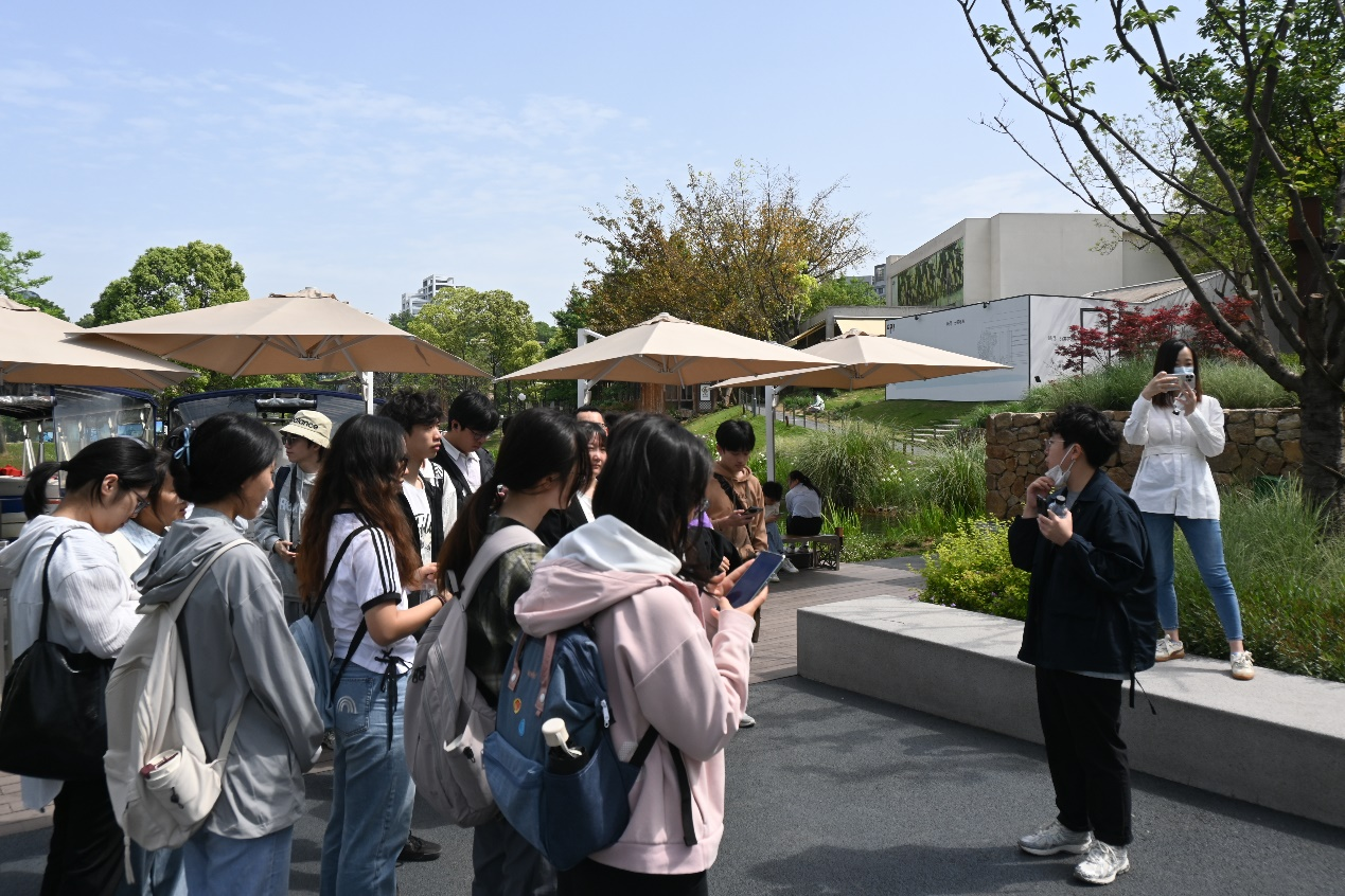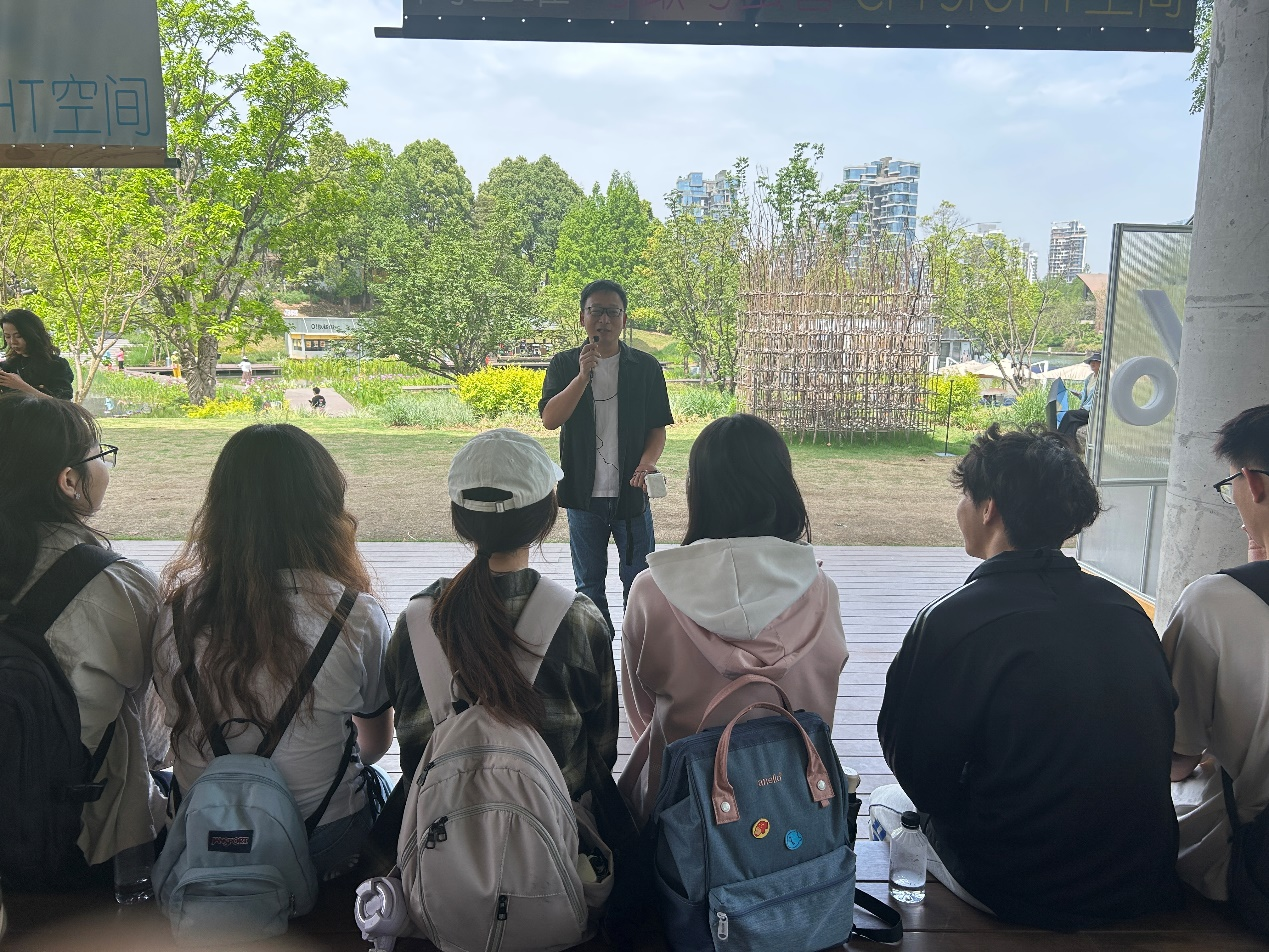 最后,同学们前往麓客岛,参观麓湖生态城中生态与商业相结合的新型商业区规划利用。在这里,阳光与绿意交织成生态商业的创新样本,同学们与万华集团的工作人员们,在这里开展了一堂微讲座。当目光掠过临湖而建的文创书店、生态咖啡馆,话题聚焦于麓湖的物理空间如何在关注人的需求与体验时,同学们将自己的所见所闻结合土地资源管理的专业知识,共同探讨麓湖生态城不同规划的区位价值之间的联系、以及产品的目标市场人群等问题,思维的火花在湖光山色间碰撞。
