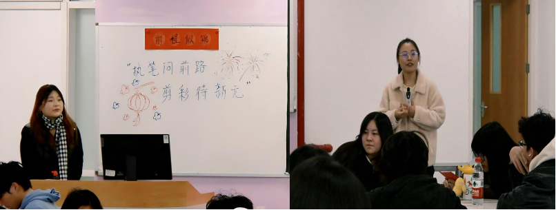本次班会活动由班长张渝荣主持,班会分为答疑交流、书写对联与剪纸迎春三个环节。班主任马秀美老师围绕学业发展、时间管理与职业规划等方面与同学们进行交流,分享经验建议,鼓励大家科学制定目标,积极迎接新阶段的学习任务。在“笔落新愿”环节,同学们现场书写新春对联,以传统形式表达对新年的美好期许。随后的“红纸生花”剪纸活动中,班主任与同学们共同参与创作,活动现场气氛融洽。