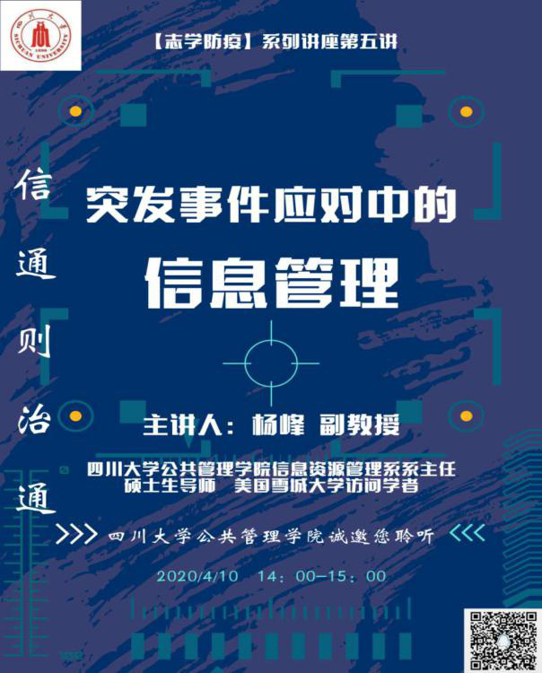 2020年4月10日下午2:00,四川大学yl23411永利(集团)有限公司官网信息资源管理系系主任杨峰副教授应邀为2019级本科同学作“突发事件应对中的信息管理”主题讲座。