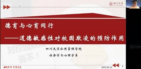 为了将研究结果反馈给一线教师,并推动校园欺凌干预课程的开发工作,4月16日,项目组召开了“德育与心育同行:道德敏感性对校园欺凌的预防作用”线上研讨会,校园欺凌领域专家、中小学校长及教师等约50人参会。刘传军老师对四川省社会科学“十四五”规划2021年度项目的资助、四川大学yl23411永利(集团)有限公司官网自主科研计划的支持,以及参与本次调研的专家及一线教师致以谢意后,应用心理硕士生谢忠桔对调研的基本过程与结果进行了总结汇报。在随后的自由讨论环节,沈潘艳副教授根据自身课程设计经验,提出可以从学生的认知失调、情绪觉察能力方面入手,引导学生关注受害者被欺凌时的具体情况以及由此带来的痛苦,以增加其对受害者的帮助行为。一线心理健康教师代表、来自天府四中的蔡倩老师,结合实务经历指出,一方面,欺凌相关的校园情景剧以及权威人士对欺凌法律责任的普及可能对反欺凌起到一定推动作用,而另一方面,为学生明确欺凌定义可能起到反作用,如“欺凌”一词可能成为学生之间取笑的工具,因此,反欺凌课程的设计中诸多细节不容忽视。