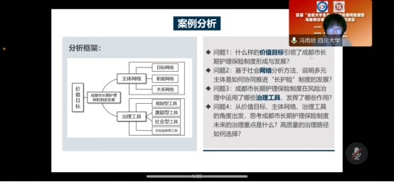 我院社会保障专业研究生冯雨欣、孙梁悦、陈晨玉、李丽婷组成长期护理保险调研小组,在沙治慧教授的指导下,针对成都市长期护理保险制度展开了一系列调查研究,以期还原成都市“长护险”制度的发展进路,提炼制度建设与治理模式的内在逻辑,为日后长护险制度在全国普及推广提供经验借鉴,最终形成《如何铸就失能老人幸福之路:成都市“长护险”制度发展进路和治理逻辑深描》案例分析报告,并在线上成果交流会上进行分享。汇报完后,专家老师针对报告内容提出了宝贵的意见与建议,指引小组成员开展后期更为深入的研究。
