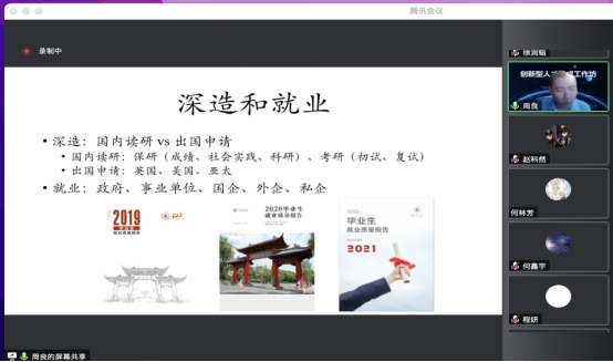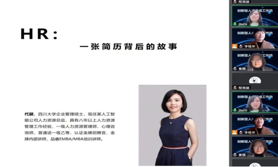 本次新生研讨课以线上的方式展开,四川大学校友、成都圭目机器人有限公司人力资源总监代颖、四川大学图书馆馆长助理兼研究发展中心主任姜晓两位资深行业专家为同学们做了分享,从社会需要怎样的创新型人才、怎样成长为创新型人才、怎样提升个人综合素养等多方面,深度解析创新型人才养成路径。