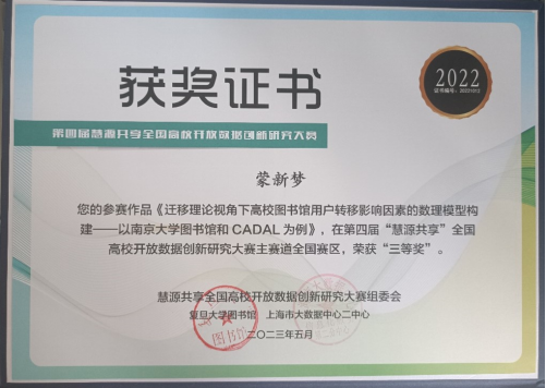 在袁莉老师的悉心指导下,我院信息资源管理专业2021级本科生蒙新梦同学的“独竹凌川”团队,以《迁移理论视角下高校图书馆用户转移影响因素的数理模型构建——以南京大学图书馆和CADAL为例》为题,探究高校图书馆用户由传统图书馆向数字图书馆转移的影响因素,为高校图书馆的发展探寻新方向,最后经过激烈答辩,荣获“三等奖”,袁莉老师获得“优秀指导教师奖”。