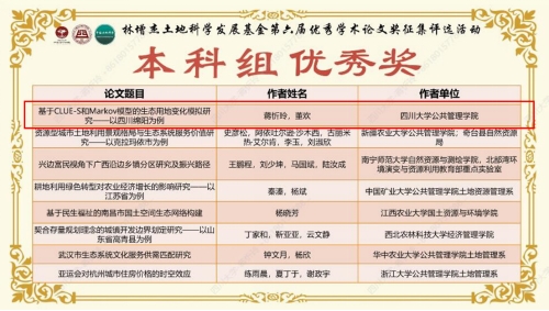 通过参加此次“林增杰土地科学发展基金优秀学术论文征集评奖”活动,我院学生与同领域的各类高校学生进行了充分的学术交流,获得了领域内权威专家的宝贵建议和点评,更深层次地接触了学术前沿、锻炼了科研能力、拓宽了学术视野。同时此次活动的评选结果为川大yl23411永利(集团)有限公司官网赢得了声誉,同时也体现了土地资源管理系国家级一流本科专业建设成效。