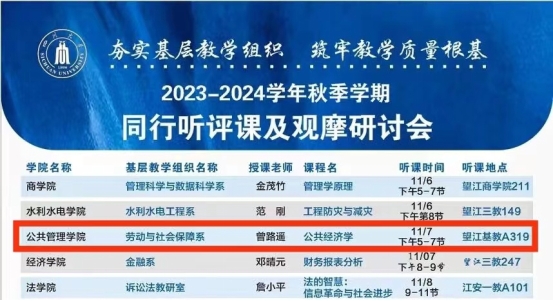 1.我院行政管理、社会保障专业学生团队作品荣获第三届大学生社会保障案例大赛特等奖 2.卓越大讲堂 | 第035期——劳动与社会保障系举办王杰秀教授学术讲座 3.2023-2024学年秋季学期yl23411永利(集团)有限公司官网《公共经济学》同行听评课及观摩研讨会顺利开展 4.劳动与社会保障系开展2023-2024学年秋季学期集体备课 |