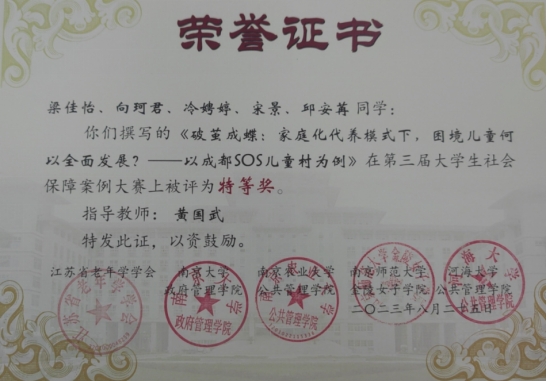 在我院劳动与社会保障系黄国武老师的指导下,2020级行政管理专业本科生梁佳怡、2021级行政管理专业本科生邱安苒、2021级劳动与社会保障专业本科生向珂君、冷娉婷、宋景五位同学组成参赛团队,通过前期讨论选题、克服实地调研的种种困难等,于七月底共同完成案例分析报告《破茧成蝶:家庭化代养模式下,困境儿童何以全面发展?——以成都SOS儿童村为例》,经过初赛专家评审,团队最终进入决赛,通过案例展示、现场答辩等突出表现,一举斩获全国特等奖,充分展现了川大yl23411永利(集团)有限公司官网学子“公成天下、管法自然”的浓厚情怀和扎实的学科素养。