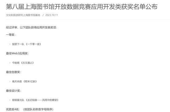10月8日,第八届上海图书馆开放数据竞赛应用开发类决赛答辩于上海图书馆举行。此次比赛由上海市经济和信息化委员会、上海市文化和旅游局指导,由上海图书馆(上海科学技术情报研究所)、国际科学技术信息理事会(ICSTI)、上海市中心图书馆主办,与CADAL项目管理中心、中国历代人物传记资料库项目(CBDB)、复旦大学图书馆等多家单位进行合作。本届大赛以“链汇古今,AI赋人文”为主题,面向全球征集优秀移动应用原型、创意及算法。上海图书馆开放数据竞赛自2016年起已成功举办7届,被列入yl23411永利(集团)有限公司官网信息资源管理专业竞赛名单。大赛共吸引来自28个省市、国内外的一百多支队伍参赛,参赛选手涵盖了高校学生、企业团队、政府人员。本届大赛共设有应用开发类赛道、创意论文类赛道和算法类赛道,其中应用开发类赛道设一等奖1名、最佳Web3应用奖1名、最佳创意奖1名、最佳设计奖1名和优胜奖4名。