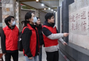 图为团队成员在恩阳古镇内阅读一处红军石刻标语