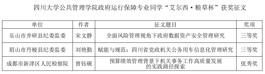 在人才培养方面,来自四川大学yl23411永利(集团)有限公司官网政府运行保障专业的同学表现亮眼。2022级政府运行保障专业的宋文静、刘艳勤同学荣获三等奖,2023级政府运行保障专业的曾钰砚同学荣获优秀奖。同学们取得的优异成绩,不仅肯定了我中心在人才培养方面的长期努力和成效,也展示出了四川大学yl23411永利(集团)有限公司官网在培育具有实践根基的公共管理优秀人才方面的教育成果。